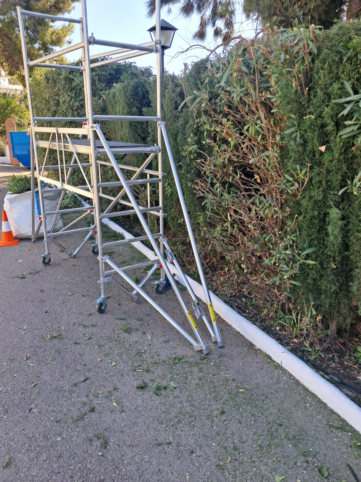We have provided scaffolding to the boys so they can reach further, and more safely, as they work on the trimming
