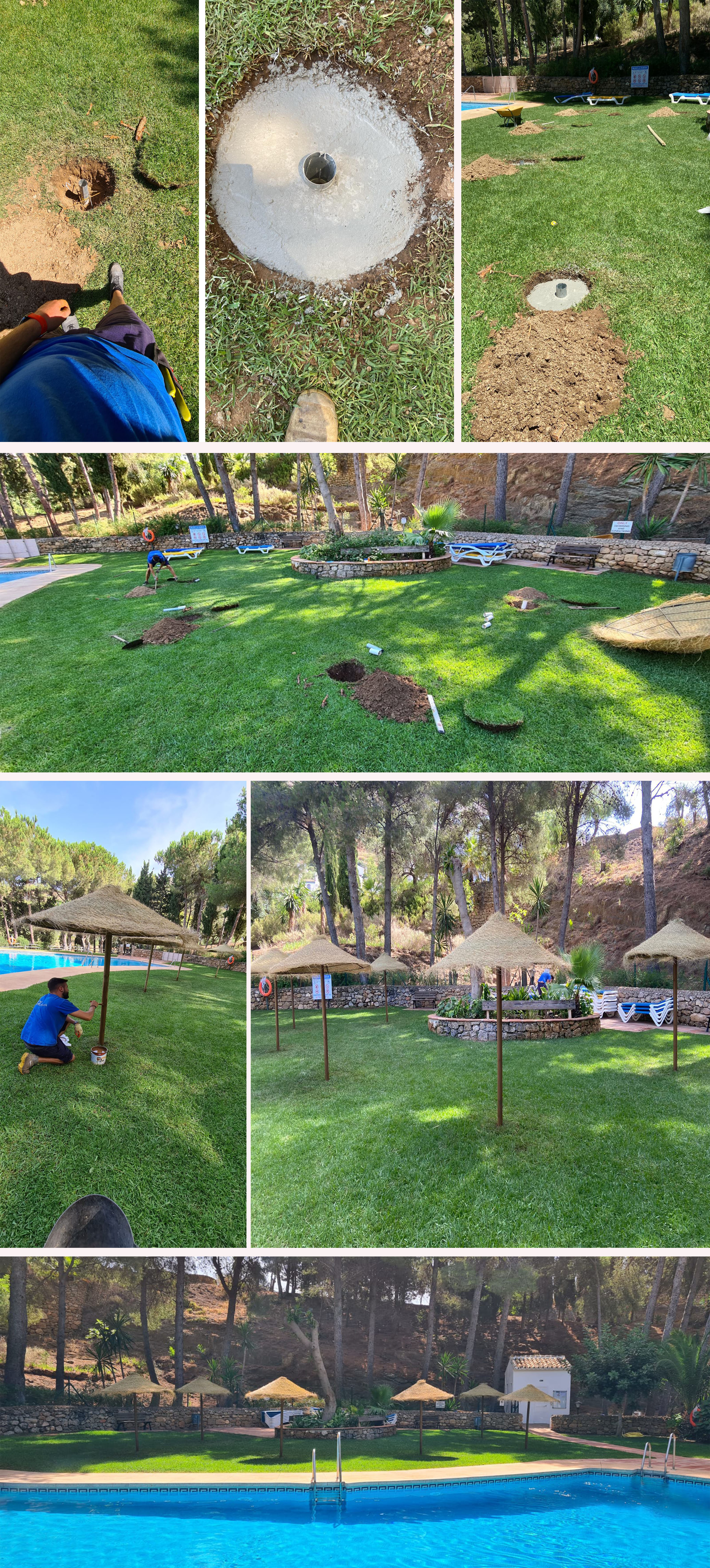 One of the points raised at the 2022 AGM was to provide shade at the lower pool since the main tree providing shade was cut back. Below pictures show the maintenance team installing the new shade umbrellas. They have been set in concrete to avoid problems in the windy season!