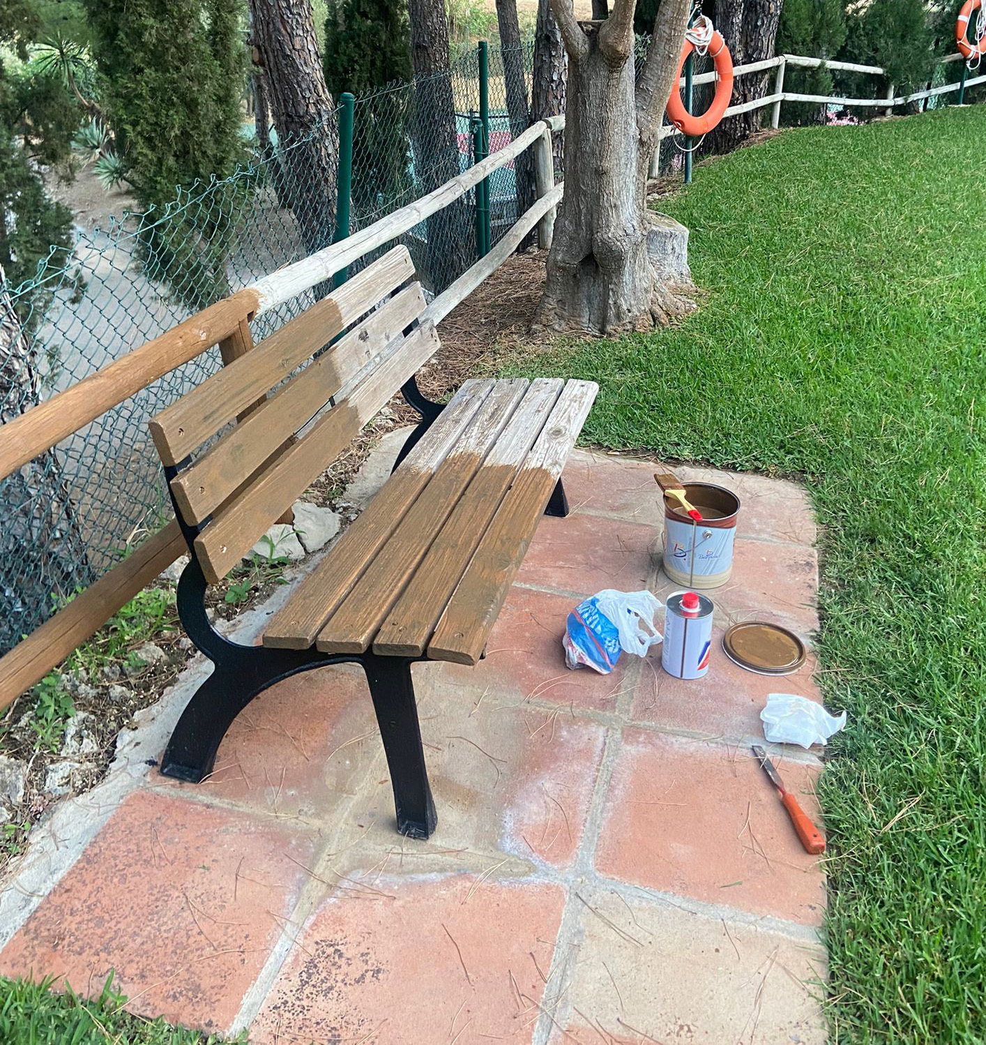 Staining the benches around the pools